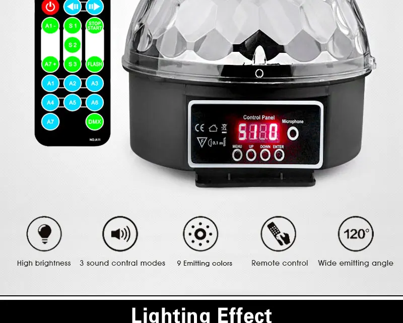 - Support DMX Control, can be connect with Professional stage,and use the DMX 512 Channels to control this ball lamp.